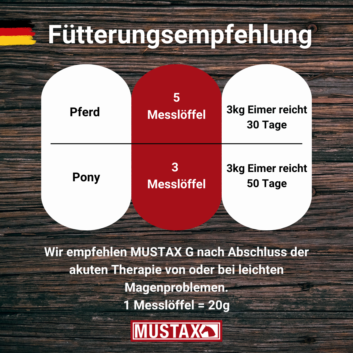 Hinweis: Bei bestehenden und lang andauernden Magenproblemen empfehlen wir, vor der Fütterung von MUSTAX Gastro einen Tierarzt zu konsultieren.